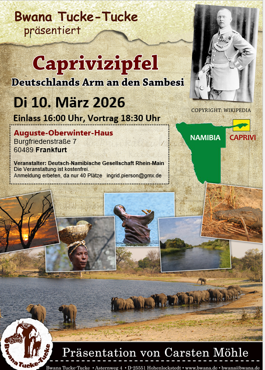 Liebe Namibia-Freundinnen und –Freunde, liebe DNG-Mitglieder im Rhein-Main Gebiet, wir sind glücklich, die erste Veranstaltung in diesem Jahr in Frankfurt im Programm zu haben, zu der wir Sie herzlich einladen. Der Caprivizipfel ist ein historisches Unikum. Seit 1890 reicht der lange Arm Namibias zum Sambesi, von dem man vermutete, dass er bis nach Tansania schiffbar […]